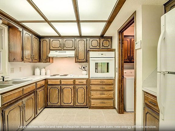 Lots of room in this lovely, well-cared for home in the desirable Ski Island neighborhood. Formal living room/dining area. Large kitchen with spacious dining area, built in desk, pantry, new dishwasher and lots of storage. Washer/dryer and refrigerator included. Nice, large front and Master bedrooms with lots of closet space and new, energy efficient windows. Beautiful large den with fireplace has beamed ceiling, beautiful wood flooring and new energy efficient patio door that opens out to the deck in a well-shaded backyard. New paint on all exterior trim, deck and storage shed. Garage has 220 outlet and attic storage access. Great location with easy access to I-44 and Kirkpatrick Turnpike. Walk to the lakes nearby. Great neighbors.
