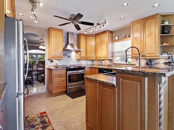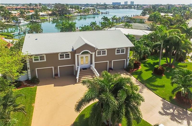 PARADISE ISLAND picture perfect and move in ready island home! This blissful retreat boasts designer landscaping with lush and tropical foliage. Pristine curb appeal welcomes you, circular drive and double door entry leads to an elevated living level with an open living space plus formal dining. Light and bright space, vaulted ceilings and wood flooring; sliders flow to deck overlooking swimming pool, waterfront and meticulously landscaped grounds. Newer impact double door entry, and $53,000 of new hurricane rated sliding glass doors on 2 levels. Newer A/C, duct work, water softener, water heater and roof. Renovated kitchen with casual dinette overlooking the waterfront. Thick granite and custom cabinetry, soft close doors, pull out pantry drawers.Tile backsplash, stainless appliances and stylish exhaust, pot filler at range, recessed lighting, tile flooring. From main living space, arched doorway leads to bedrooms; spacious master with private bath, walk in closet with organization shelving. Both baths are fully RENOVATED with double sinks and marble tile showers. Elevated construction with 4 car garages and bonus party room on main level (non-insurable). Bonus entertaining room boasts built in bar and wood look tile plank flooring. Sliders lead to covered patio and overlook the fabulous pool. *Limited seawall and dock, perfect for kayaks and paddle board enthusiast! Enjoy the Treasure Island lifestyle with local restaurants and sandy beaches only a moment away. Check out the attached drone video!