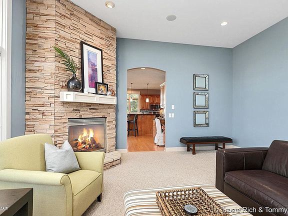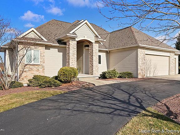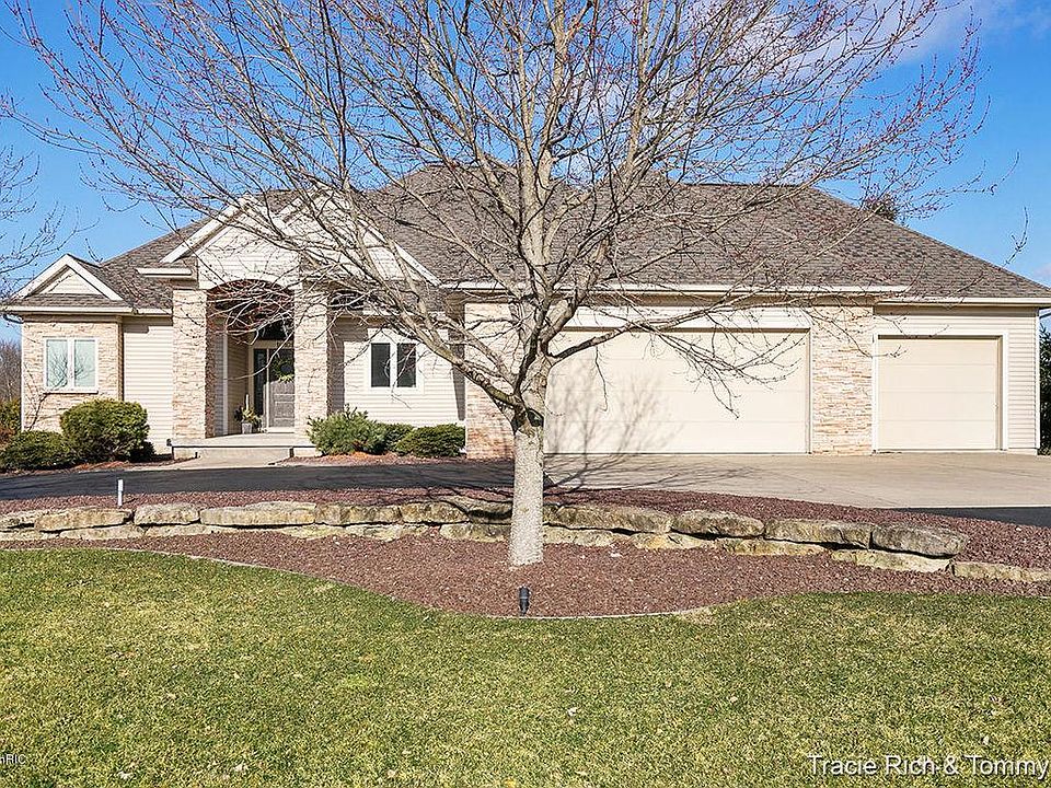 Welcome to this amazing executive style ranch home, located in Rockford on a private lake with the White Pine trail right next to the subdivision. You will love the view of the lake and the state land insuring your views won't change anytime soon. Never enough storage....this home has a ton! With a 3 stall attached garage and a lower garage with a paved driveway that can fit up to 4 more cars, your lake toys or an abundance of storage. As you enter you will notice the beautiful views from just about any room. The soaring ceiling and bank of windows in the living room is breathtaking along with the gas fireplace. The kitchen has had numerous updates and is perfect for entertaining with a dining area and leads to a screened in porch. The large master bedroom over looks the lake.