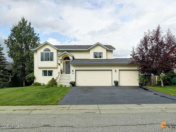 NO HOA on this large 70 foot wide lot allows for a 3 car garage and a driveway to park your RV,boat or other toys.Built in 1999 this home has been loved and maintained by the only family it has everknown.The fully fenced South West facing yard combined with mature trees carefully planted by present owners makes this a sunny oasis all day long.Gardens are full of perennials planted with love whichbloom all summer long. Interior has just had a facelift to include new Luxury Vinyl Plank, Carpet and Pad, White Trim, Stainless Steel Appliances, Light Fixtures, Vanities and much more. Great open kitchen is great for family gatherings. New BBQ deck was just installed off kitchen. Spacious family room with access to large fully fenced backyard. Spacious three car garage to store all your Alaskan toys. OPEN SUNDAY SEPT. 5TH. 1-4