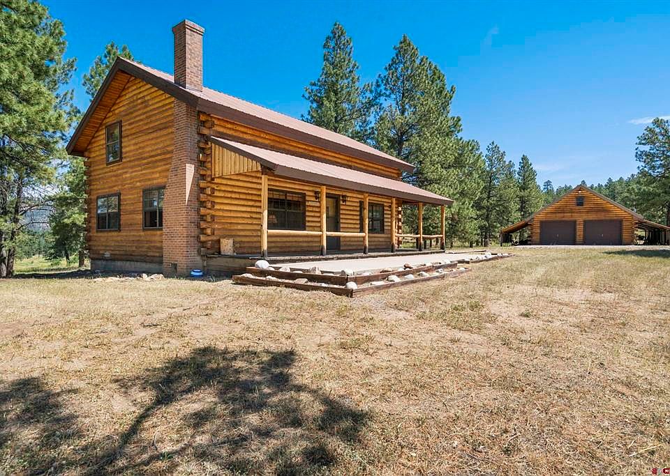 This is the first home built in Deer Valley Estates and has been in the same family for nearly 40 years. Built utilizing a D-Log design that maximizes the inherent energy efficiency of a log home, this lovely cabin has a wonderful open design with a well appointed kitchen and dining area that opens to a comfortable living room with tall vaulted ceilings and a super efficient Federal Airtight wood burning stove. There is a large bedroom and full bath on the main living level as well as a big laundry and storage room that has access to a side deck for convenient access to firewood. The huge covered front porch is over 1,000sqft and is the perfect place to relax and enjoy cool Colorado summer days and watch dozens of hummingbirds feed at the multiple feeders. Upstairs is a huge loft, double walk in closet and bath that serves as the primary suite. There is another large room upstairs for additional sleeping quarters, office or bonus room. The home sits proudly on the high point of the gently rolling 4+ acre property providing great views of the surrounding Ponderosa Pine forest and mountains beyond. There is a 900sqft oversized detached two+ car garage with tons of storage space in the attic above and on the sides of the garage. Deer Valley Estates is a gated community surrounded by over 11,000 acres of National Forest and provides multiple points of access to community members for hiking, biking, horseback and ATV riding. Bayfield is just 10 miles to the west, Durango is 25 miles to the west and Pagosa Springs is 35 miles to the east. Deer Valley is horse friendly and has been recognized by the National Fire Protection Association as a Firewise Community. Fiber optic is recently installed throughout the subdivision for highspeed internet.