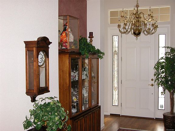 Beautiful 2175 sq. ft. ranch patio home in Castle Pines; it is the Heritage model built by Village Homes-one of their most popular plans; the home has 2 bedrooms plus a den that has French doors; the master features coffered ceilings, a 5 piece bath, and his and hers walk-in closet; custom window coverings and paint; custom stained-glass windows are on both sides of entry door and in dining room; the large kitchen includes all appliances and has 42" upper cabinets; the newer washer and dryer are also included; the laundry room has a utility sink and cabinets; the great room has five speaker ceiling surround sound and includes Sony projection TV, DVD player, Marantz receiver, and turn table; there are 2 DISH receivers; the great room features a gas fireplace; ceiling fans are in the great room and both bedrooms. A second refrigerator,a ping pong table, and a sofa bed, all located in the unfinished basement, are included.