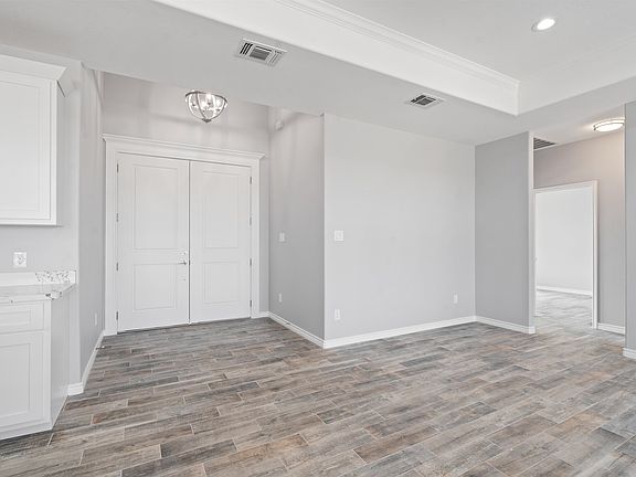 Open floor planHigh ceilingsCustom cabinets with quartz