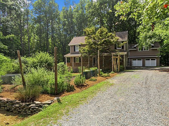 In town, but private 3BR 2.5 BA home with first floor master, 2 car garage, finished workshop and beautiful studio/office above. Large, private .92 acre lot has incredible fenced in front 'yarden' with walking paths and water feature. Fenced in backyard with lots of room for play and shaded recreation. A towering multi-story deck with water feature connects the house with the detached garage with finished workshop area. Beautiful light-filled studio/office space above with bathroom and sink. Balance life and work. Grow well here. Come see what life can be today. No HOA. Close to schools, shopping, trails, and I-40, RTP and RDU.