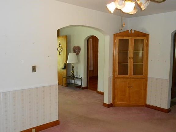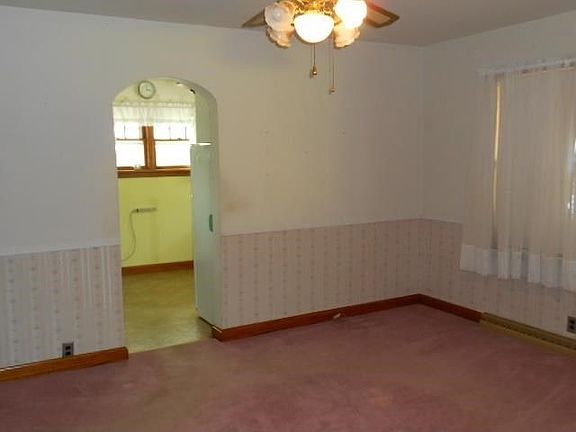 If a home on a corner lot in a small town appeals to you, you will want to see this home. The home has a great front porch, a living room with natural woodwork, a formal dining room with a built in china cabinet, 2 bedrooms, bath and kitchen with white cabinets and appliances. There is also a 1/2 basement for storage and a 1 car garage.