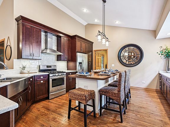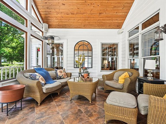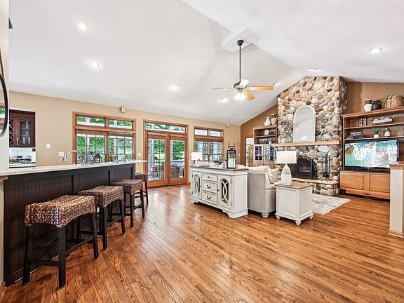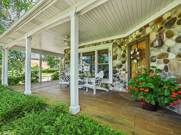 Easy living meets charm in this impressive stone and cedar ranch, set on a beautiful .80-acre wooded lot. Entering the market for the first time, this stunning home is the builder's own and showcases exceptional quality throughout. Attention boaters, River Pointe offers exclusive access to having your own boat slip on the Fox River, for a small annual fee. Enjoy the community gazebo and firepit or cast a line from the shore. The stone wraparound front porch is your first hint that this house is something special. Just past the spacious foyer, you'll find yourself in the warmly inviting great room with a floor-to-ceiling stone fireplace. There are vaulted ceilings throughout the main level, except for the primary suite, which has a tray ceiling. Beautiful Hardwood floors in the kitchen, great room, office & halls. The dazzling kitchen is huge and open to the great room, boasting dark maple cabinets and quartz countertops. The large wood-topped center island serves as the kitchen table and provides extra storage. There's an impressive amount of counter space and cabinets for even the most dedicated chef. Under the sink, you'll find a reverse osmosis system. The seller's favorite spot is the 23 x 13 three-season room with its beautiful wooden ceiling, ideal for dining or hosting friends, surrounded by nature. This 299 sq feet bonus living space is not included in the square footage. Off the foyer, behind French doors, is a versatile space currently used as an office, but it was originally a dining room. The primary suite is spacious enough for the largest bed and multiple dressers, with room for a cozy reading chair in the alcove. A large walk-in closet, and a bonus closet, lead to the en-suite, which features a separate shower, spa tub, and dual sinks. Two guest bedrooms are situated on the opposite side of the house for added privacy, along with a full bathroom and a half guest bathroom. A first-floor laundry and mud room are conveniently off the 3-car garage. The mud room is plumbed for a sink, but they have a folding area over there currently. The full basement has a large rec room and a pool parlor and the table and equipment are included. A large fourth bedroom leads to a workout/bonus room with a walk-in closet. Perfect as a guest room thanks to the nearby full bath. There's ample storage throughout. This home is perfectly located near highly-rated schools, shops, and restaurants. Foxford Hills Golf Course is a few streets away, along with two other nearby golf courses. You can walk to Hickory Grove Highlands, the Riverfront Conservation Area, and walking trails. It's close to the Sunburst Aquatic Center and Cary Lake at Rotary Park.
