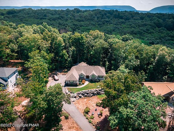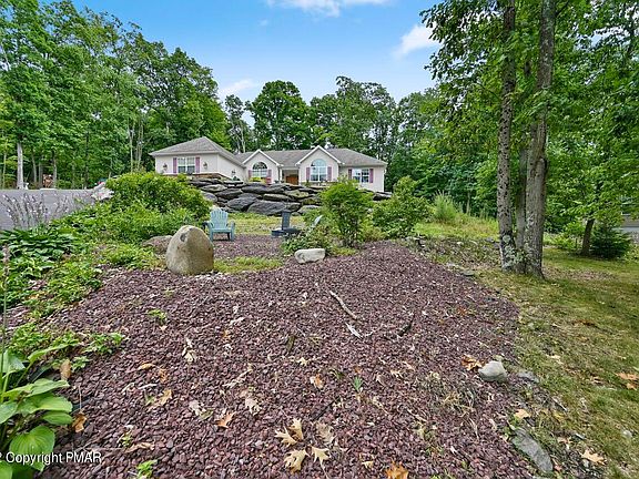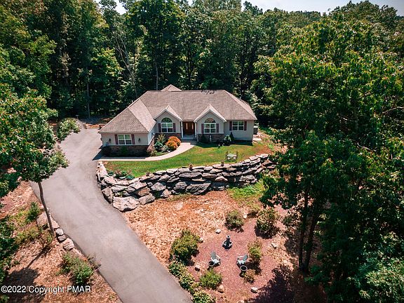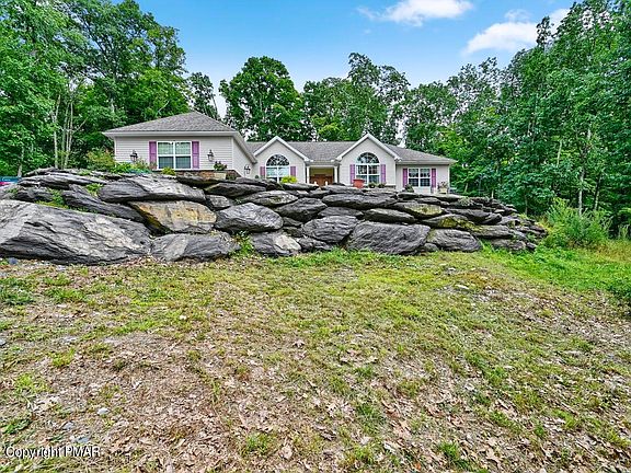 'Property is Under Contract and considering back-up offers only at this time. A double charmer. Located in the highly desired Twin Lake Estates built by the #1 Builder in the Poconos. Just minutes away from I-80, schools, hospitals, and more. This luxurious, custom-built ranch features an abundance of conveniences and architectural character in a highly sought location. Walk across the paved and beautifully landscaped front entry. Enter through the grand double door foyer, you'll be captivated by plentiful natural sunlight, picturesque arched windows, and arched doorways leading to the ample great room. Sit high atop this quiet cul-de-sac with breath taking sunset views or watch the hummingbirds while relaxing on the covered, treehouse like deck. Enjoy gas cooking in the dazzling and spa kitchen surrounded by subway tile, upgraded granite countertops, Westmont cabinetry, SS appliances, and more. Entertain family/friends in the high-ceilinged great room, airy dining room, wet bar area, or your all-season deck. An energy efficient home equipped with a 21 SEER Infinity Carrier heat pump with digital keypad control and a gas fireplace with hot air vent. Two water heater tanks will give you an almost endless supply of hot water. Too many upgrades to mention. Recently painted, well maintained, move in ready. Make this award winning 3 bedroom, 2 1/2 bath, extended 3 car garage home yours. Don't let it get away. Call to view today. HOUSE HAS 730 SQ FEET OF DRY GARAGE SPACE FOR STORAGE AS WELL AS A HUGE DRY ATTIC AND CRAWL SPACE FOR STORAGE.