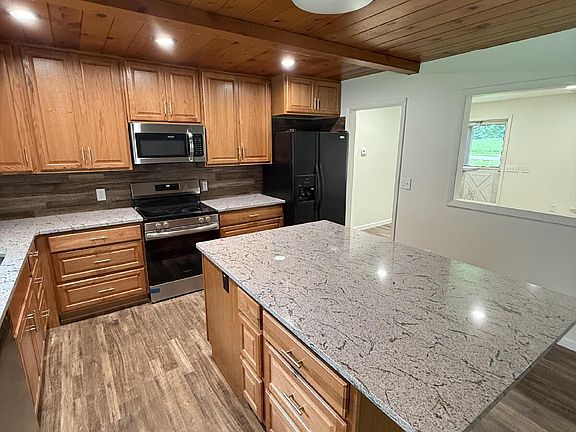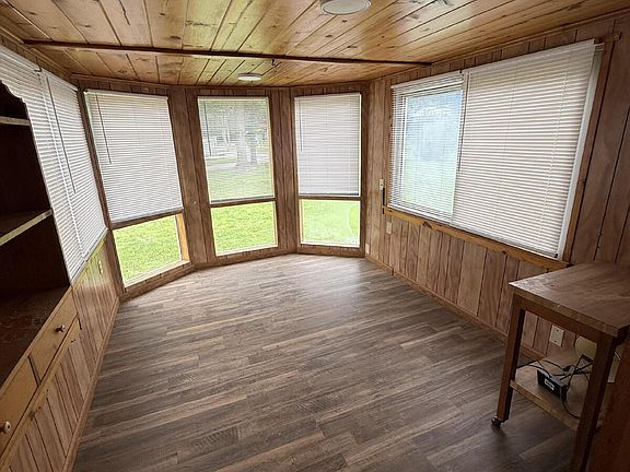 The home features a spacious kitchen and dining area, stone countertops and cabinets galore. Large center island is a chef's dream! Step inside to a large, open living area with beautiful wooden walls that add warmth and rustic charm. The bright sunroom is a perfect spot to relax with a morning coffee or unwind in the evening, taking in the scenery.