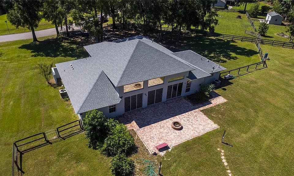 One or more photo(s) has been virtually staged. Surrounded by an equine community and resting within Hickory Meadows in the northern region of Ocala, this stunning estate has been fully renovated and offers over 1-and-a-half acres of Central Florida tranquility. Gently shaded by mature trees, the home is surrounded by tasteful landscaping and has been recently painted. Stepping inside of the stunning wooden double-doors, the interiors of the home feature lots of natural light with an open, split-bedroom floor plan, high 10’ and 12’ ceilings, and new paint throughout. The all new kitchen is well-suited for those who enjoy spending time cooking and has been fully upgraded to include a large center island with breakfast bar, plenty of cabinet storage with wood cabinetry, ample counter space, contemporary light fixtures, new unused high-end stainless steel appliances, and adjacent dining area. The family room includes a cozy floor-to-ceiling stone facade wood-burning fireplace that has never been used as well as a built-in entertainment center and huge windows with stunning views of the property beyond. In fact, the majority of the back of the home features these huge windows, allowing the beauty of the scenery to become its own feature of the home. All bedrooms are nicely spacious, but the master suite is particularly peaceful with a large layout, two separate closets, and a private en-suite with dual vanities, large garden tub, and a lovely walk-in shower that is equipped with a rain-style shower head– all of which has been recently upgraded. All bathrooms throughout the home have been completely redone with new vanities, counters, flooring, lighting, and more. Passing through the home, it’s difficult to find any area that hasn’t been updated. The back of the home is a real show-stopper that is overlooked by the large mirrored-finish floor to ceiling windows mentioned previously that strike a perfect balance between the natural beauty of the property and the thoughtfully designed home. A large brick patio provides ample space for seating, entertaining, and relaxing and includes a built-in fire pit for added options. The backyard beyond is partially fenced with board and wire fencing for added security, and there is plenty of room to add even more customizations to the backyard if desired. Hickory Meadows is a wonderful community located less than 30 minutes from Downtown Ocala’s many shopping, dining, event, and medical options for those looking to explore more of what the area has to offer. If you’re looking for a move-in ready dream-home, this property is a true gem!