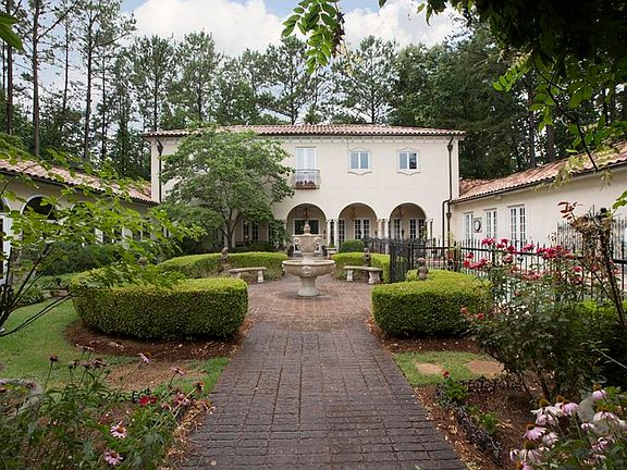 Beautiful Tuscan Style Home in private gated community The Estates at Town Lake. Courtyard fountain and brick walkway entry through a garden courtyard. Spanish tile roof, 12’ x 50’ private pool and hot tub, rose bushes, courtyard tree, and travertine courtyard patio. Renovated interior with mosaic and tile entry into double fireplace main hall. Spacious 10 foot ceilings on 2 stories, elegant crown molding, track lights and recessed lighting updated throughout the house, built in bookshelves, roman columns and crystal chandeliers. Upstairs master bedroom overlooking courtyard garden and french balcony with custom french foor room sized walk-in closet. Upstairs master bath with modern jacuzzi tub and large custom built dual shower room. Additional master bedroom on main floor with closet, large bathroom and skylight shower. Large multipurpose room or study adjacent to downstairs master. Chefs kitchen with 14 foot prep table and commercial appliances. Over 50 cabinets and wine storage wall with 250+ bottles capacity. Two large car garages with 4’x8’ ceiling mounted storage racks and two large rooms with full bathrooms, laundry, mini fridge and sink area on each main floor wing of the house. Steam Sauna and fitness room adjacent to french door entry multi-purpose tiled tea room. Upstairs guest room with courtyard view and elegant adjacent full bathroom. Convenient upstairs laundry connections for washer and dryer in enclosed closet. Enlarged driveway to accomodate parking for guests in addition to 4 parking spaces in garages. 1.14 acre property with large wooded backyard. Beautiful solid wood round top double door with vines at entrance to courtyard. This is a very unique house in the beautiful Towne Lake Parkway area of Woodstock, one exit from an outlet mall, and easy access to the highway and ITP Atlanta.