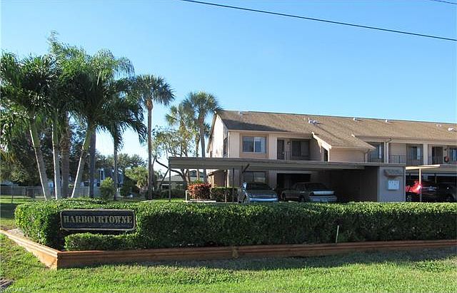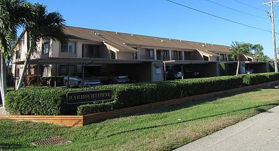 Great location just off Country Club. Harbourtowne condos are beautifully maintained and feature a nice pool area looking out on to the wide Rubicon canal. This condo is upstairs which provides for cathedral ceilings making the unit feel more open. There are sliders to a screened lanai from the living and bedroom. The condo has been replumbed and the air conditioner has been replaced in the last couple of years. There is covered parking and an outside storage area. Dock space is available.