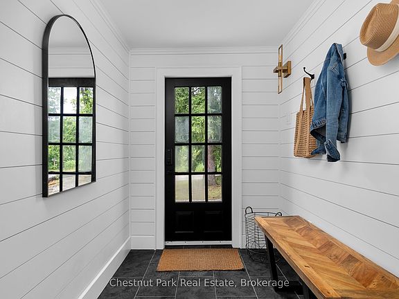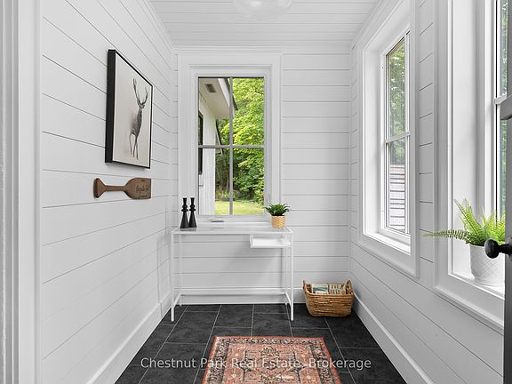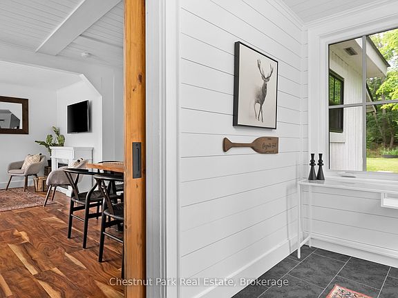 Welcome to 1011 United Church Rd, a charming 984 sq.ft., 2-bedroom, 1-bath home that beautifully blends modern comfort with rustic warmth, just steps from Lake Joseph and The Cove Marina. A welcoming foyer leads to a spacious, open-plan living area, perfect for entertaining. The modern kitchen is a dream, featuring a high-end stainless-steel range, a retro fridge, and a custom backsplash. Throughout the home, rich acacia hardwood floors, contemporary windows, and interior shiplap create a cozy atmosphere, complemented by a gorgeous bathroom updated in 2021 with a luxurious rain shower. You can also enjoy the outdoors from the inviting 3-season Muskoka room, which offers stunning views of the surrounding woods and granite outcroppings. The backyard is a private oasis, ideal for relaxing in the hot tub (2022) or gathering around the fire pit and barbecue area. The property is equipped for year-round living with baseboard heaters and smart thermostats, which, along with an electronic keypad lock, allow for remote monitoring of heat and access, providing peace of mind. Additional updates include the electrical system and roof shingles, both from 2020. This home is ideally situated across the road from The Cove Marina for easy boat access to Lake Joseph and is just minutes away from fine dining, shopping, golf, and spas. This home is best seen to be fully appreciated!