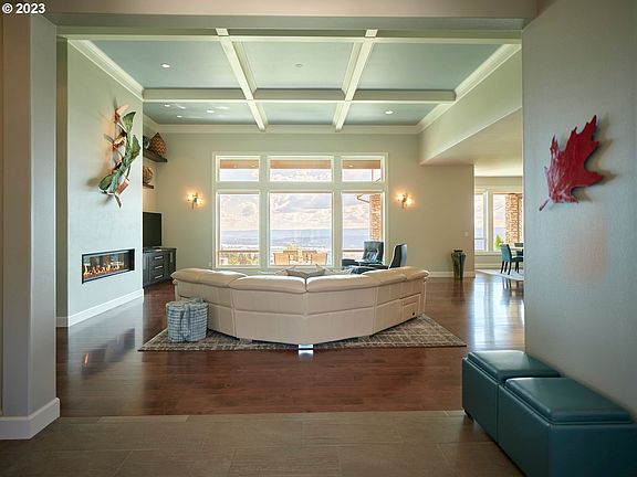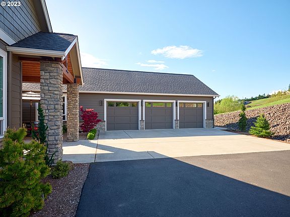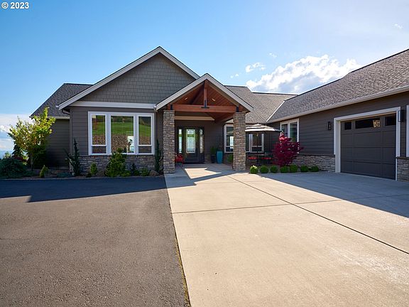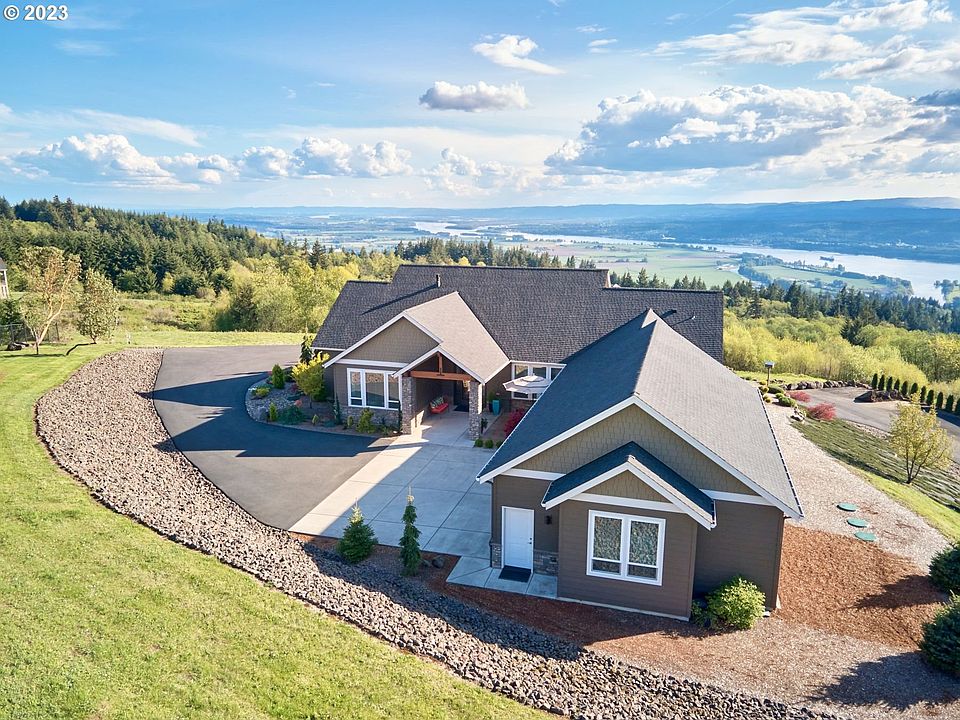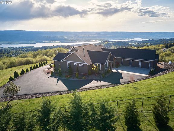 Welcome to your dream home nestled on a secluded hillside, offering breathtaking Columbia River views, where style meets sophistication. This stunning home boasts timeless elegance and offers the perfect blend of luxury and comfort. As you step inside, you are greeted by an inviting foyer adorned with exquisite details and an abundance of natural light, setting the tone for the rest of the home. The spacious open floor plan seamlessly connects the living, dining and kitchen areas, creating an ideal space for both intimate gatherings and grand events. As you enter the great room, you'll be impressed by the 13 foot box beam ceiling, 5 foot linear fireplace with multiple settings and expansive windows to take in the views. The gourmet kitchen is a culinary masterpiece, featuring top of the line stainless appliances, farmhouse sink, custom shaker cabinetry and a 10 foot center island topped with a single slab of granite. The primary suite is a tranquil oasis designed with relaxation in mind. Indulge in the ultimate comfort and unwind in the luxurious ensuite bathroom, complete with a spa-like soaking tub, a walk-in shower with rain head, double sink vanity, heated floors and custom walk-in closet. The additional bedrooms are generously sized, offering ample space for family members or guests. Flex space room with double door entry could be used for office, hobby, media room or even a gym. The oversized three car garage provides plenty of space for vehicles and extra storage. Sitting on a generous 2 acre lot, the stunning custom home is an entertainer's delight, featuring a covered patio for year round use with a crank down solar sun screen. Perfect for hosting summer gatherings or enjoying quiet evenings under the stars, gazing at the display of lights across the river and away from the hustle and bustle of city life. Don't miss your chance to own this spectacular hillside view home.