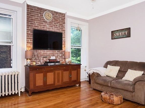 This beautiful 2 Bedroom is flooded with natural sunlight! Featuring 9 1/2 ft ceilings and classic details of exposed brick and crown molding throughout the home. Stainless steel appliances and granite countertops throughout the kitchen and bathroom along with ceiling fans all through the residence provide for a great living experience. Washer/dryer in unit and only 1 flight up! It has enough space for a proper dining table and offers additional space/storage in the basement and a common yard. Ideally situated a few blocks from Trader Joe's and Shoprite as well as near amazing restaurants. Close to NYC bus & parks. Heat & hot water included! Available for 5/20 move in.