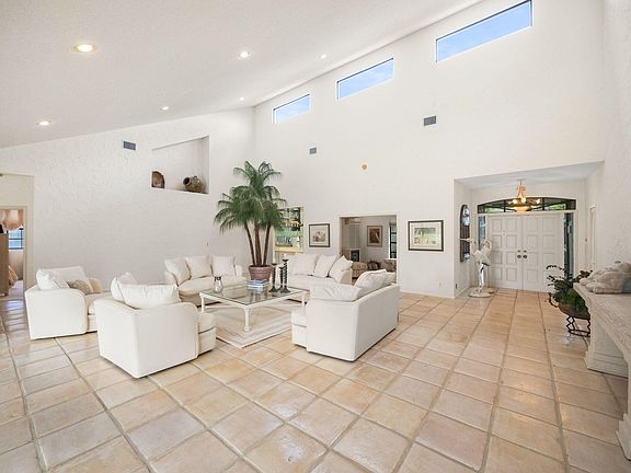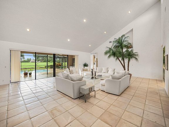 Experience the grandeur on entering the Great Rm of this 4 bed/ 2.5 bath home from the circular driveway. Impressive with it's expansive space, unusually high ceilings, artistically textured walls, chiseled stone floor tiles & wet bar, all brightly lit by windows, sliders & transoms. Access the screened pool deck w/ summer kitchen & golf course view from multiple rooms. Extended to add a 15' x 18' dining area, the bright, eat-in kitchen w/ canal view features a cathedral ceiling, pantry, granite counters, d/w, brand new range & microwave, & a compactor. Baths include step-down showers, dual sinks, pedestal sink in powder rm, new toilets. Other features include Central Vac, well-water irrigation, ...continued....... ....exterior security lights. Huge garage has an a/c drop & a side door. Low HOA dues, No Club Membership Required, a low $1000 Capital Contribution on purchase. Note: PBC Property Appraiser incorrectly shows this house to be a 5/2. Listing Agents Joel or Robin will show you the house on short notice. No lockbox/Supra. House is offered As-Is.