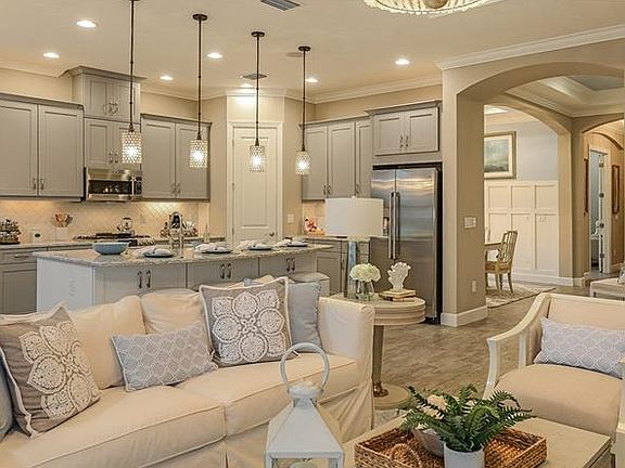 Under Construction Farnese 3 car garage with 3 Bedroom 3.5 bath, Interior 8 foot doors, Pocket Doors Den Tray Ceilings, tile in main living area, upgrade cabinets, Quartz Kitchen counter tops, Paver Lanai, Upgraded Appliances, Wood Laminate Master, Level 5 Backsplash Kitchen. Water view and so much more. Move in by December. photos are of the model and not actual home.