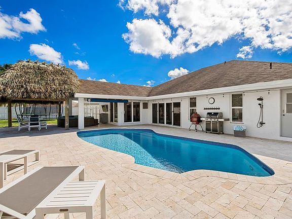 Welcome home! This beautifully renovated house and property is set up perfectly for the family and for entertaining. Located on a cul-de-sac, in a great neighborhood with top rated schools. Florida’s outdoor living at its finest; including a large sparkling pool, spacious yards, new travertine decking and tiki hut. This home offers a newer AC unit, impact windows, a bonus den/office, and much more.