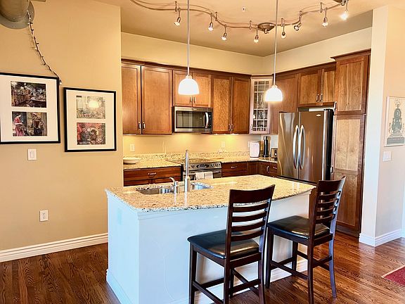 Just painted Sept 1, 2024. This is a "model" unit with upgraded appliances and finishes. Unfurnished. Faces W-NW with views from Mt. Evans to Longs Peak. Open, bright and spacious with wonderful sunsets. 2 underground parking spaces [with 2 storage cages] in secured parking garage. Owner pays water/trash. Renter pays gas & electric. No smoking. Pets no more than 10 lbs.