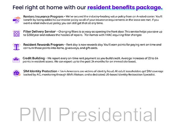 At PMI - Presidential, we strive to provide an experience that is cost-effective and convenient. That's why we provide a Resident Benefits Package (RBP) at a rate of $45.00/month to address common headaches for our residents and provide must-have services for our renters. The Total Monthly Price of $2045.00 includes rent, air filter delivery, credit building and more, required with the rental. Residents have the option to personalize some components during onboarding, which may increase or decrease the monthly amount. More details upon application.