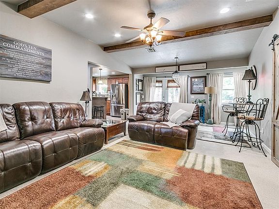 Well cared for home on one Acre with a 30X50 insulated shop ,home is 2153 Sq Ft in Carl Albert schools. Spacious living, Dining, Kitchen. Main bedroom (22x21) hosts walk in Closet, large walk-in shower. Kitchen with double oven, gas stove. Tile back splash. Attached garage is 736 sq ft with a walk-in storm shelter. 30x 50 Shop with 2 ,10 ft doors. Front porch and large deck off the back, allow for outside relaxation.20x30 Pad & cover, electric hook-up for RV. A must see!
