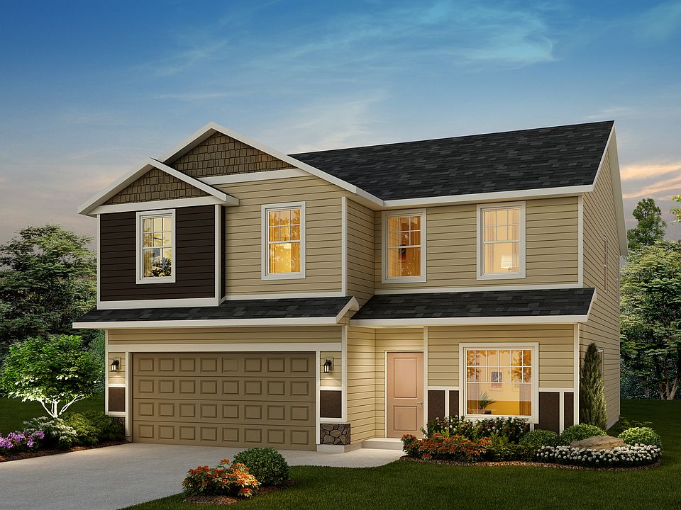This two story plan features stone accents at garage. Main floor includes 9 ft ceilings throughout, a formal dining room, double door entry to the office, and a half bathroom. Open floor concept from the family room, dining nook, and kitchen. Kitchen features 42inch upper cabinets, an island with eating bar overhang, Moen pullout stainless steel faucet, stainless steel appliances, and a pantry. Second floor includes half walls at staircase that open to loft area, all three bedrooms, full guest bathroom, and laundry room for added convenience. Master suite features a large walk-in closet, and spacious full bathroom with double sinks, garden tub, and 5 ft fiberglass shower. One guest bedroom also features a walk-in closet.
