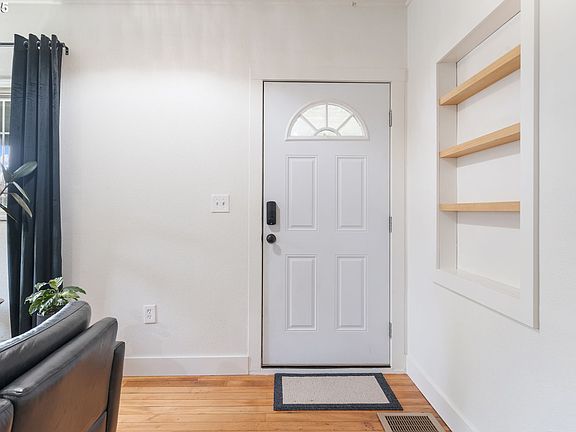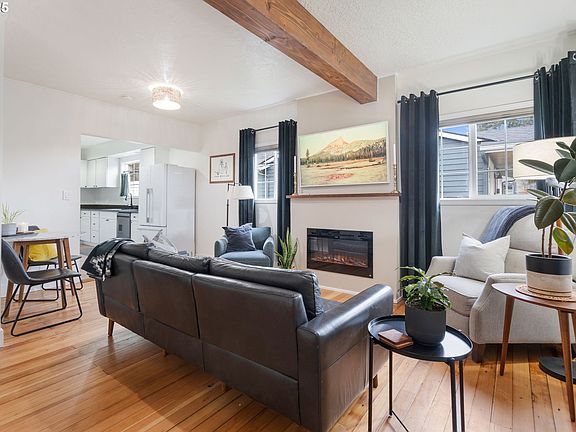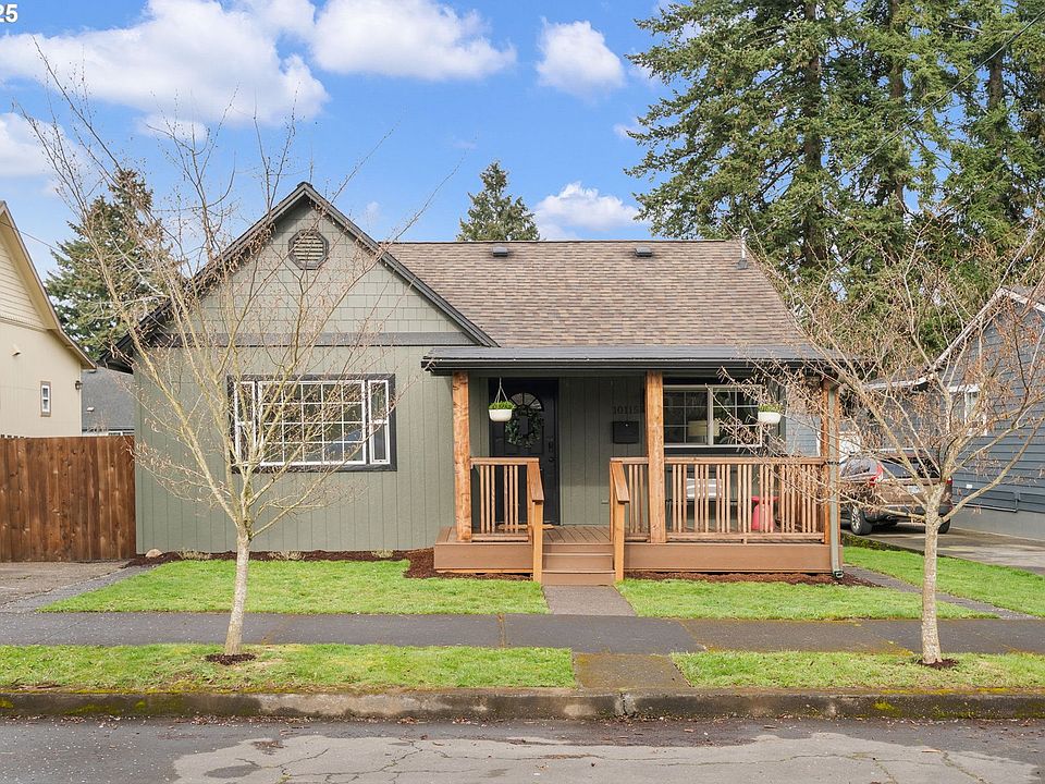 Charming bungalow with a darling front porch nestled in the heart of St Johns. Filled with an abundance of natural light, this home offers an open floor plan with beautiful refinished fir floors, and has been meticulously cared for. Step into the inviting living room with tall ceilings, complete with an electric burning modern fireplace. The kitchen features ample counter space, newer appliances, & plenty of cabinet space. The bedrooms are spacious, with the primary suite serving as a true retreat. Large enough for a king sized bed, it offers its own bathroom with ample storage, a new vanity & large walk in closet space. Downstairs presents a blank canvas with incredible storage opportunities or the potential to add additional finished living space. Outside, the yard is a true haven with both covered and uncovered patios, additional sun shades, a beautiful magnolia tree & an incredible walnut tree. Thoughtfully landscaped with plenty of room to run in the grass & a wonderful place to entertain! Updates include recently refinished fir floors, a new front porch, painted exterior, new fencing, added garbage disposal & a thoughtful build out of the electric fireplace & mantle! This home is just a short stroll from delicious dinner spots, including Pastificio d'Oro, Gracie’s Apizza, and the St. Johns Food Trucks. Enjoy top-notch coffee from nearby favorites like Daydreamer Coffee, Sparrow Bakery, Cathedral Coffee, & The Great North! [Home Energy Score = 5. HES Report at https://rpt.greenbuildingregistry.com/hes/OR10188657]