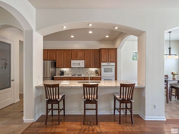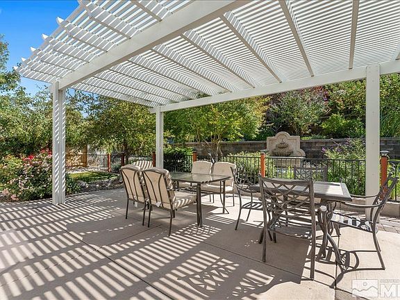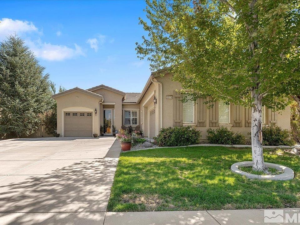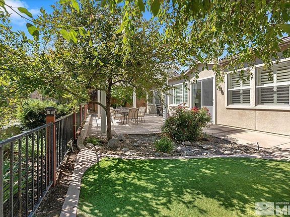 Hurry over to see this gorgeous single story, open floor plan home on a large and lush private lot in South Reno. Many sought-after features include hickory hardwood floors, plantation shutters, new granite kitchen counters and epoxy floors in both garages. The backyard oasis boats an expansive patio with pergola as well as a terraced garden highlighted by a handsome bubbling fountain. Enjoy a summer-long harvest with grape vines, apple, pear, plum and nectarine trees., The dining room and main living area overlook the garden Relax by the fire in the living room or in the primary bedroom's jetted tub. Two more good-sized bedrooms, a second full bath and a fully functional laundry room with sink and cabinets round out this thoughtfully designed 1904 square foot home,
