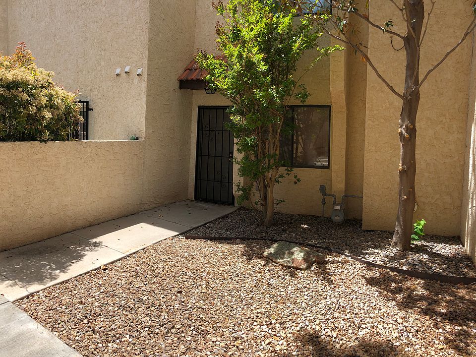 Located in quite courtyard off Gutierrez NE. Bright and clean home located walking distance from CNM Montoya Campus, nightlife, shopping, restaurants and churches in northeast heights. Senior center and park across the street. Custom light wood cabinets and ceiling fans throughout. Tile in kitchen, laundry foyer and entry. Carpet throughout living area and bedrooms. Skylights, alarm system, smoke alarm and walk-in closets. Private patio with gate entrance. Property faces courtyard for quiet days and nights. One car garage with additional parking space just outside patio gate. New Aero Cool air conditioner and water heater. Excellent school district: Eisenhower Mid School and Eldorado High School.