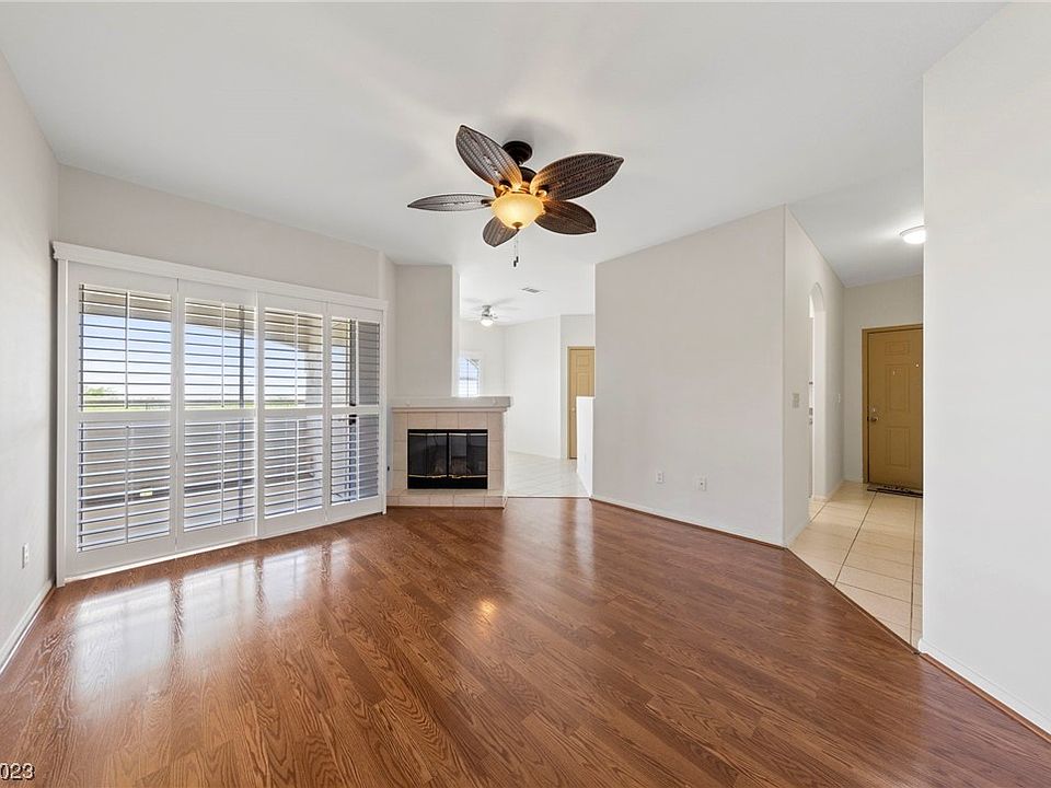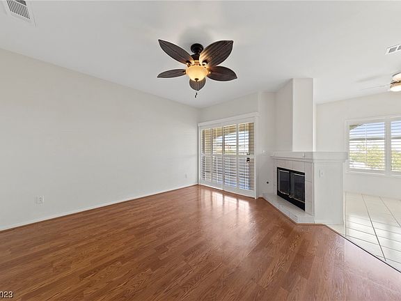 Adorable condo in the heart of Summerlin. This 2BR/2Bath (2nd floor 1 level) home has Tile & Pergo flooring (no carpet) throughout. Spacious walk in closets in both bedrooms, ceiling fans throughout, Plantation Shutters, 1 car garage. Get cozy this winter in front of the fireplace while checking out the mountain & city views from your own private covered balcony with entrances from Living Room & Primary. Washer/Dryer/Fridge included. Brand new hot water heater. Fantastic location, Amazing amenities: Pool, Spa, Fitness Room! Close to Restaurants, Freeway, Shops and more....