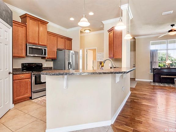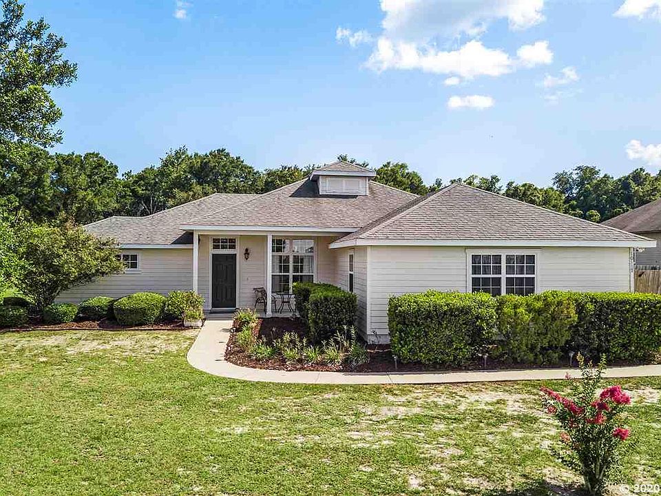 The convenience of city living meets the serenity of country living with this charming 4 bedroom, 3 bath home on a PRIVATE 1.11 acre lot, which backs to Paynes Prairie, and has an acre common area next door, offering exceptional privacy. This functional 3-way split open floor plan spans just under 1,900 sq. ft. All living areas are connected with gorgeous new Acacia wood floors, including the foyer, formal dining room, great room and guest hallway. The open kitchen offers 42" maple cabinets, a new farm house sink, SS appliances, and a pantry. Master bedroom off foyer and great room, with en suite bath with sep. water closet, step in shower, Jacuzzi tub and double sink vanity. Check out the new cedar lined organizational system in the master closet. Two guest rooms off the breakfast nook share a hallway pool bath.3rd guest room has access to the hallway bath between the kitchen and laundry room. Summer's around the corner! Enjoy the 18,000 gallon HEATED salt water pool.