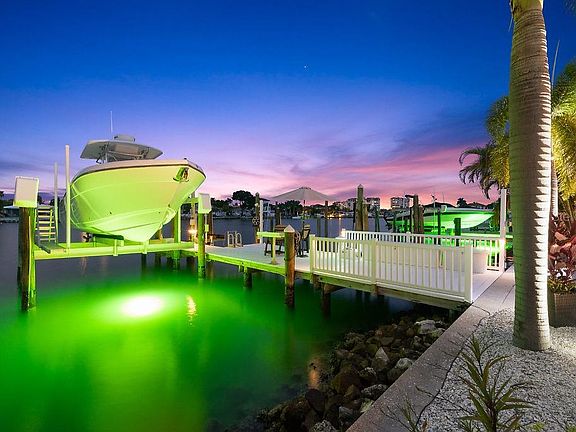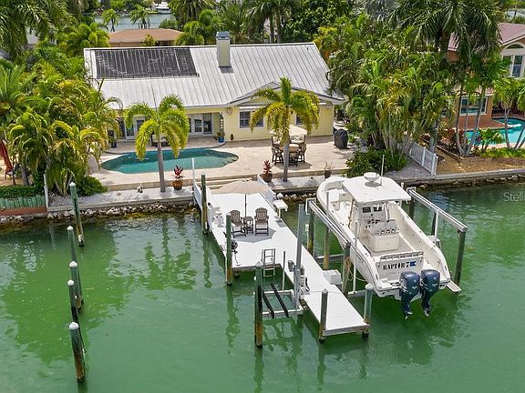 Boaters paradise dream home! Wow! This is the definition of Florida waterfront living! This Key West style home is truly one-of-a-kind. Designed by an award winning builder. The outside and inside of this magnificent property is as vibrant and bright as the Florida sunshine. Enjoy resort style landscaping and lighting in the front and back. Take a cool dip in the custom solar heated saltwater pool with changing color lights in the evenings. Admire the recently leveled travertine pavers around the pool and driveway. Grab some shade under the covered lanai with ceiling fans and 3 misting fans or under the retractable awning with remote. Enjoy the magnificent view of the DEEPWATER on Boca Ciega Bay. Rip Rap seawall. Large lighted boat dock with a 20,000 lb boat lift, jet ski lift and 45 foot slip with tide slides to accommodate all of your toys! Step inside this spacious open floor plan with vaulted ceilings and wood flooring and totally updated in 2008 when this home was taken down to the walls and the roof was raised. Beautiful entryway with painted wood ceilings and decorative columns. Hurricane windows and doors with automatic shades on outside of sliding doors with remote. Plantation shutters. Media Closet with surround sound inside and out, Cat 5 wired. Water softener. Enjoy the great-room with wood burning fireplace and sliding doors overlooking the pool, dock and water. Kitchen with custom cabinets, granite countertops and stainless steel appliances including double ovens. Large island with sink, beverage refrigerator and wine cooler built in. Spacious pantry cabinets. Large master bedroom with sitting room area and magnificent views of the water and pool. Master bath has beautiful slate throughout, amazing reclaimed glass countertop, free standing tub and unique walk-in shower with pebble floors. Two large guest bedrooms, guest bathroom also with slate tile and reclaimed glass countertop. Large 2 car garage with Monkey Bar storage, epoxy floors and reinforced garage doors. This slice of paradise wont last long! Set up a showing today!