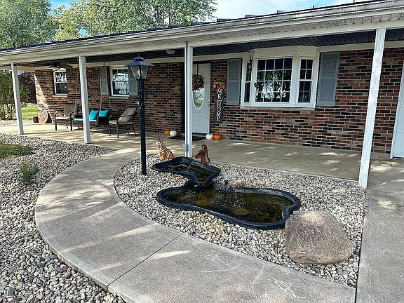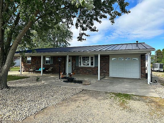 Brick ranch home in Versailles. Large front porch with swing and ceiling fan, sunroom, covered back patio with hot tub/ceiling fan/exterior lighting, large heated detached building with water. This home offers 4 bedrooms (master bedroom is large enough to add second bath and walk in closet), 1 bath, family room, living room, kitchen/dining room, large bathroom. New in 2024: carpet in 3 bedrooms, fresh paint in every room, new plumbing for kitchen and bathroom, new electric for front porch, new landscaping. New in 2023: well pump, water softener, water holding tank, heating elements on water heater, insulation in attic/treatment by Orkin, all new appliances (refrigerator, double oven stove, above stove microwave, dishwasher, garbage disposal), added bedroom, new leaf guards on gutters, electric added to building to allow for RV parking. Come enjoy the quiet country living just outside of Versailles.