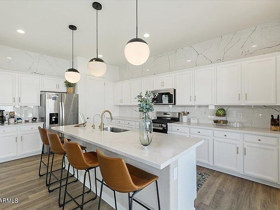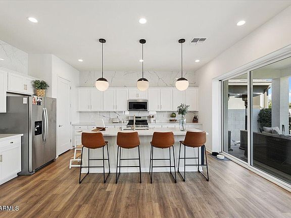 Step inside to discover an open-concept layout that seamlessly connects the elegant kitchen to the living area. The gourmet kitchen boasts pristine white cabinetry, a generous breakfast bar, a large center island, and a walk-in pantry, all complemented by stainless steel appliances. Expansive windows and soaring ceilings flood the space with natural light, creating a warm and welcoming atmosphere. This living area effortlessly transitions to a backyard oasis, complete with a covered patio and a spacious play area featuring lush artificial turf. The main level also includes a versatile flex space that can serve as an office, den, or formal dining area, along with a private full bedroom and bathroom, ideal for guests or extended family.