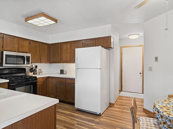COME AND SEE! - End Unit Townhome style 1/2 Duplex with large 2 car garage attached, concrete driveway & welcoming brick exterior in front. Large living room with vaulted ceiling. Separate Dining Room is open to both Living Room and Kitchen. Spacious Eat-in Kitchen with Pantry just around the corner. Six windows connect interior living space with the expansive deck in back. Step outside for grilling and warm weather fun (partially fenced yard). Two huge bedrooms upstairs - each with walk in closets - and a Jack-n-Jill full bath. Primary suite includes extra seating space & its own sink/vanity near the bathroom entry. Convenient laundry located on the bedroom level. Well maintained - quality wood laminate flooring on main level and exterior siding are 4 years new, dishwasher & microwave are 2 years, & fresh springs on the double garage door. NO HOA, low taxes. Located in the desirable Bent Tree Ct Cul-de-Sac community, close to groceries, restaurants, schools, community college and all the services of the beautiful Gail Borden main public library with Fox River views. Easy access to Metra, I-90, Rt 25, and Rt 59