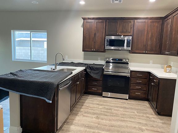 Brand new 4 bed, 2 bath home w/ PAID SOLAR! Generous great room w/ stunning kitchen that overlooks the dining & living space. The kitchen features quartz countertops, walk-in pantry & beautiful stainless steel appliances. Luxury vinyl plank flooring and 9ft ceilings can be appreciated throughout the home. The generous master suite features walk-in closet & ensuite bath w/ double sink. The home also features nicely sized guest bedrooms, great indoor laundry w/ custom cabinetry & 2-car insulated garage. This energy efficient new build comes equipped w/ owned 8kw solar system w/ Enphase microinverters, AC unit Seer 14, 2x6 construction w/ R-19 insulation in walls and R-38 in the ceilings.