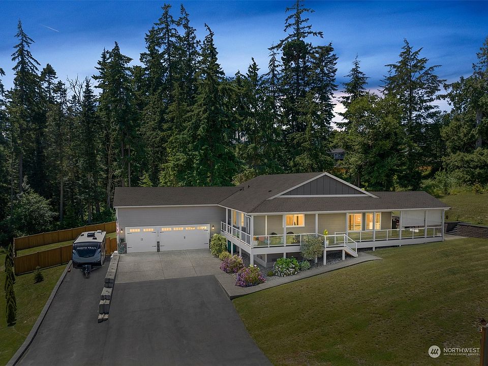 ~Single Level Island Living~ This expansive rambler with nearly 2,200 sq ft features 3 BD, 2 BA, den/office, HUGE 3 car grg, RV Parking, a covered patio/deck sitting on over 1 acre! Whether walking the covered, wrap around deck or enjoying the yard space, this property exudes amazing views of the sound, wildlife, mountain peaks and everything else the great PNW has to offer. Beautifully built and finished interior with hardwoods, quartz countertops, vaulted ceilings, a primary bedroom with 5 pc en-suite bathroom and so much more! Epoxy finished floors in the garage with it's own mini-split unit to moderate the temp! Quick walk to the water/community boat launch to enjoy those cool summer nights and beach days. Tour today!