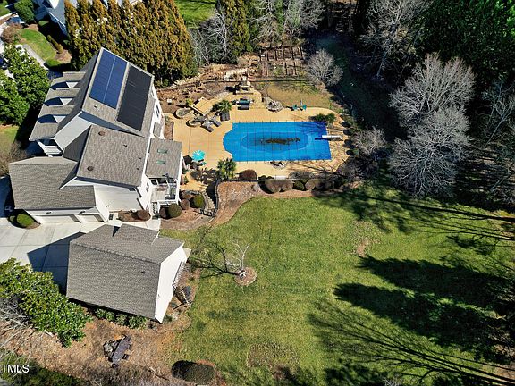 Private oasis in North Raleigh! Stunning home with double front porches tucked away on a cul de sac has room for everything. The first level features gracious formal areas, cozy family room and guest bedroom. The updated kitchen makes meal prep easy! The primary bedroom suite has a spacious bedroom, sitting area, huge walk in closet, heated bathroom floor and oversized spa like shower. The front bedrooms on 2nd level opens to the relaxing covered porch. The second floor bonus room is perfect for homework, craft projects or watching TV. The full finished basement is well appointed with a wet bar, exercise room, playroom and office. Fantastic outdoor living space with salt water pool, spa, fireplace, covered patio. There is a garden area outside of the fenced back yard. The wood stove on the screened porch allows for four season use. The detached garage is a car lover's dream with finished area above it for your favorite hobbies. The solar panels provide for heating the pool and also gives energy back to the grid with a credit to your electric bill. Roof replaced 2 yrs ago, HVAC 2-3 yrs,. Third floor walk up attic has tons of storage or can be used for future expansion. You will love this home!