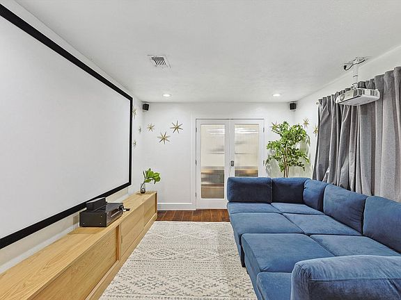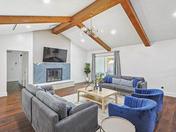 Step into this stunning living room and immerse yourself in designer furnishings and decor that exudes comfort and style. The vaulted ceilings and modern fireplace offer an air of sophisticated elegance. Sink into the plush couches and enjoy the abundant natural light that spills through the windows, creating an inviting and warm atmosphere. This living room is the perfect retreat for any occasion!