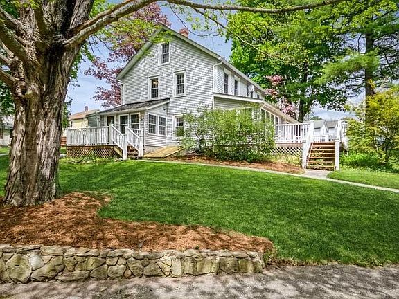 So much to love in this delightful Old-style Farmhouse Colonial. Gorgeous property includes a tremendous 3 car garage/barn with beautifully finished loft/recreation room complete with vaulted knotty-pine ceilings, heat, electric, and cable. This was originally a two-family residence that was masterfully converted back to a sprawling one family, with two-separate electric meters... so many possibilities here. Gorgeous Corian & Cherrywood kitchen offers ceramic tile plank floors and SS appliances. Stunning remodeled bath showcases a huge seamless glass rain head shower with pebbled tile, marble vanity and porcelain tile walls and flooring. Endless updates include roof, siding, windows, furnace, HWH, 200 amp electric, mahogany decks with PVC railing, radiant heated floors, 7k reverse osmosis system, 25 GPM Artesian Well w/ delicious drinking water, solid 6 panel pine doors throughout, plus so much more. LR features a striking fieldstone FP with heatilators to warm those winter nights. Spacious home also has a full walk-up unfinished attic with original wideboard flooring and basement with interior access plus bilco doors. Minutes to train, shopping, and town make this the perfect place to call home. SELLERS REQUESTING BEST & HIGHEST BY 5PM ON THURSDAY, 5-19-22