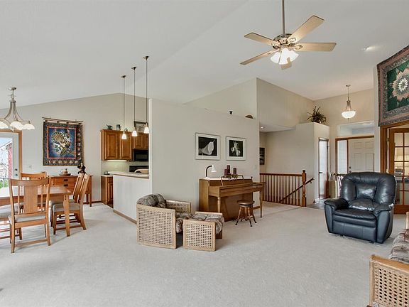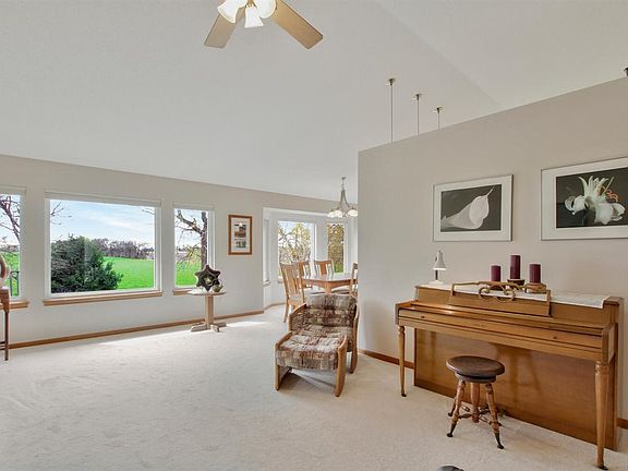 Custom built home, beautifully maintained on Newton's NW side. This seller thought of everything! When you enter the foyer, you are immediately greeted with AMAZING views. The large triple picture windows in both the living room and dining room add such wonderful natural light with a wooded tree line and open farm space behind. Such a private setting! 10 ft ceilings throughout with vaulted living , dining and kitchen ceilings. Office with French doors off of the living room. Kitchen includes appliances, an eating bar, and a nice pantry area with utility sink/storage and access to the back deck and side yard. A second main floor bath with a walk in shower combined with utility room. Master bedroom with lovely corner windows, vaulted ceilings, access to private master deck(composite), large walk-in closet, bath with double vanity, soaker tub and oversized separate shower. The basement is such a nice feature as it has so many options for use! Large rec room, full kitchen and dining space, two bedrooms and a full bath. Basement is a view out/ walk out. The way the space was designed, would allow for long term guests to have a completely private space with a private entrance while you could still enjoy the large rec room. The seller often hosted people from their church staying for an extended period. It was also perfect for large family gatherings. The exterior entertaining space is FANTASTIC with a large patio, room for a fire pit and lovely views. Two composite decks, gorgeous yard with sprinkler system, covered front porch and just charming curb appeal. The garage is a real plus. The depth allows for long vehicles with still plenty of room for a workbench, freezer, bikes, mowers, etc. Just steps from Newton Highschool. Special taxes are VERY LOW and pay out in 2024!