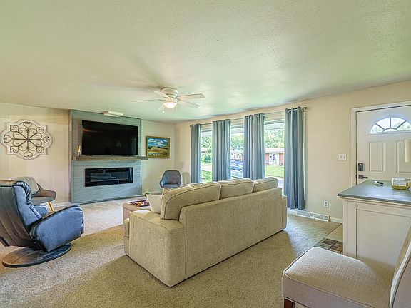 UPDATED, VERY CLEAN home situated in a welcoming, established neighborhood. The spacious living room has had a delightful, cozy electric fireplace added & the large front window was replaced in 2024. The tastefully updated kitchen opens to a bright dining area and has a tile floor, lots of cabinet space, updated light fixtures, and a charming barn door added for separation from the utility room. The large primary bedroom has a stylish headboard incorporated & features illuminated headboard sconces that stay with the home. The bathroom is updated to show off a modern look with newer light fixture & faucet. The nice-sized backyard is neatly kept and offers an enjoyable place to relax. The eave of the roof covers the short walk from the back door to the back garage door. The roof was replaced in 2022.