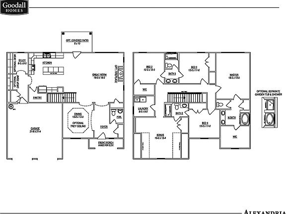 Alexandria floor plan has plenty of space for the whole family with 4 bedrooms, bonus room could be 5th bedroom, 3.5 bathrooms, formal dining room, and study.