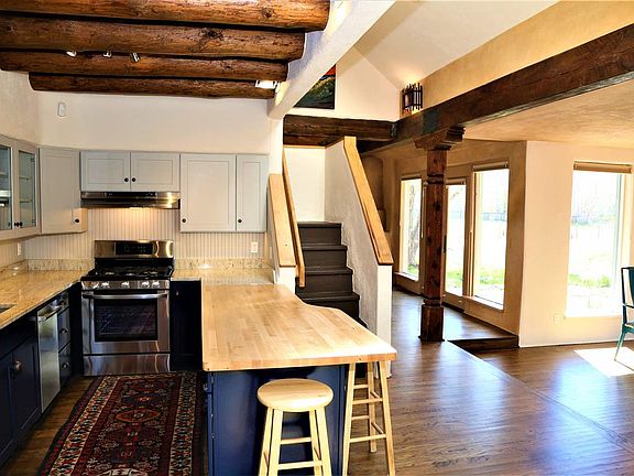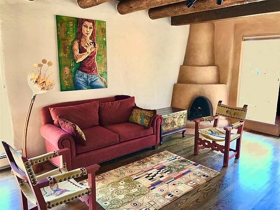 Approaching this magnificent property along the gravel driveway, you are greeted by landscaped lawns, colorful trees, & shrubbery welcoming you home. This lovely renovated 2534 sq ft. Territorial style 3 bedroom/2.5 bath home sits on 2.34 acres with exceptional views. Quiet yet close to town. As you step through the Nicolai Fechin inspired front door, you enter the light filled living room w/ its large vigas, reclaimed barn wood ceilings, refinished gleaming oak floors & kiva fireplace with gas insert. The thoughtfully designed kitchen is a cooks' dream featuring; custom cabinets, beautiful granite counter tops and a large butcher block peninsula & new stainless steel appliances. A wood stove gives added warmth and ambiance. Easy entertaining is provided by the large adjoining dining room which can spill out even further onto a patio for outside seating. French doors open to a small walled terrace. There is a half bath off the kitchen. The luxurious first floor Master Suite awaits with its kiva fireplace, lovely dressing room, along with a separate bath w/ jetted tub & steam shower. Two carpeted upstairs bedrooms sit on opposite sides of large sitting room. The upstairs bath features a spectacular "Rain Forest" marble counter top with a malachite green colored basin and large soaking tub. Throughout the house are new Hunter Douglas blinds for heat efficiency & easy use w/ "top down bottom up" feature. Skylights and many new windows amplify the special light of this beautiful home. A large fenced pasture for your horses, 667 sq ft. barn w/ stall, chicken coop, an acequia & surface water rights complete this peaceful sanctuary. Landscaping includes a variety of mature Apple, Crabapple, Pine, Aspen, Locust, & Willow trees as well as lilac, juniper & privet hedges. Home has natural gas & private well. Call us to tour this remarkable home.