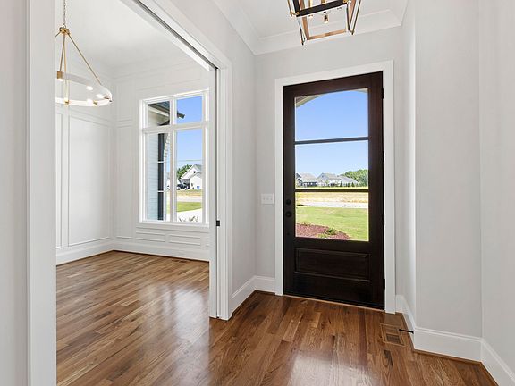 One of the final Poythress Construction home opportunities in the Preserves at Holland! Renowned for exceptional craftsmanship and attention to detail, this stunning new build is thoughtfully designed with luxurious finishes throughout. As you step inside, you're welcomed by a striking home office featuring custom built-ins, an eye-catching accent wall, and a statement chandelier. Rich, site-finished hardwood floors, soaring 10-foot ceilings, and refined crown molding create a sense of elegance and spaciousness across the main level. The expansive kitchen seamlessly connects to the dining area, living room, and porch—perfect for effortless entertaining and enjoying meals al fresco. Tucked away at the back of the home, the primary suite offers serene privacy with views of the wooded backyard. It boasts a spa-like ensuite bath and a generously sized walk-in closet with custom shelving. Upstairs, discover three additional bedrooms—one of which could be used as a bonus room, complete with a wet bar for added convenience. Two additional full bathrooms and a walk-in storage area give you everything you need on the second floor. Located in the heart of Fuquay-Varina, this home offers the perfect blend of Southern charm and modern convenience, just minutes from trendy restaurants, local shops, and vibrant community amenities. Don't miss your chance to own this beautifully crafted retreat!