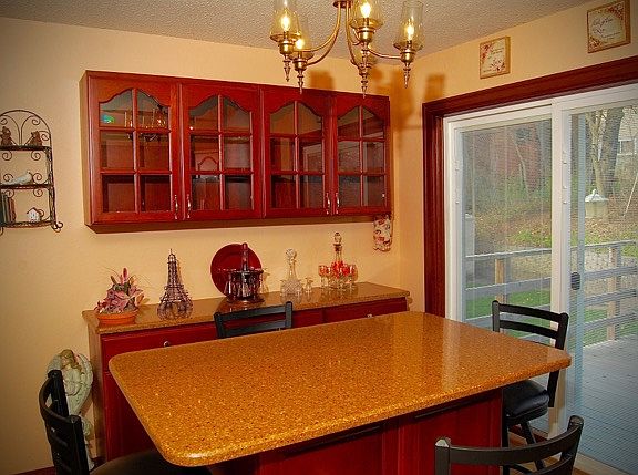 Beautiful updated kitchen with cherry Bertch cabinetry. Quartz counter tops, center island, built in china cabinet, stainless steel refrigerator, stove, and built in microwave. Appliances are included. Sliders out to the deck for great grilling and entertaining with roll up sun shade. Spacious living room with vaulted ceiling and new carpet. Main floor bath features a 5' shower, large vanity and full size washer and dryer with cabinetry above. The washer and dryer are included. The first floor includes a family room, den, and 1/2 bath. Ideal space for home office! Two car garage with shop area sectioned off, extra parking area off the drive for boat, trailer, or camper. Newer roof, heat pump, water heater, central air unit, vinyl siding, stone accent, and a covered front porch.