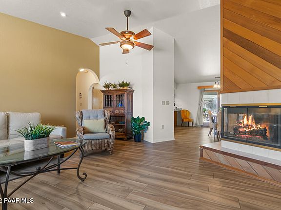 This beautifully well-cared for 3-bedroom 2-bathroom home in desirable Prescott Country Club is waiting for someone who loves active outdoor living in the summer and the warmth and glow of a fireplace in the winter. Live on one level in this split floor plan home with easy entry from the garage or from the front. You'll love the clean wood-look porcelain-plank flooring in the living and dining room and cozy carpet in the bedrooms. Bright granite kitchen counters, gas range and lots of room in this kitchen make it a cook's dream. The backyard is fenced and has a good-sized wood floored shed for storage. The covered patio is a cozy and quiet place to entertain and enjoy the shade of the well-established trees.
