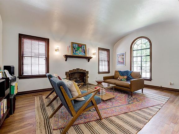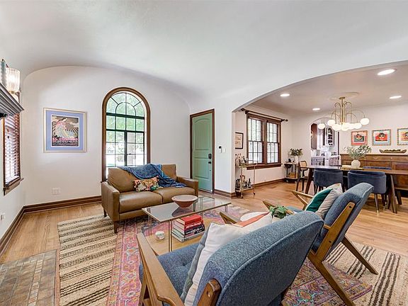 Inside, the living room’s barreled ceilings, rich wood trim and striking fireplace, with intricate artisan tile, create an inviting space perfect for both daily living & entertaining. Sunlight cascades through the signature arched window, casting a warm glow across the original hardwood floors.