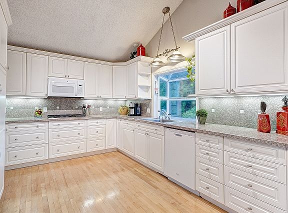 This 2,340 home features an entertainment deck, patio, open floorplan with kitchen, eat-in dining room, living room, plus 4 bedrooms, including the master suite. There is also a lower level recreation room with huge wet bar and attached 2-car garage and an upgraded Hardiplank siding on front of the home as well! Enter the large foyer and bright living room with double doors etched in glass design, closet for storage of shoes and coats, and slate flooring. The open living room has vaulted ceilings and a wall of windows overlooking the front grounds. At the center is a wood-burning fireplace with floor to ceiling brick surround. The kitchen is abundant of storage- white raised-panel cabinetry with crown molding, built-in pantry, in-cabinet drawers, overhead storage and display shelving. It also has soaring vaulted ceilings and garden window above the sink. All appliances stay, including the in-wall convection oven, refrigerator, 4- burner gas cook top, newer dishwasher and micro-hood. It also has granite with full-length backsplash and decorative inset counter space. Hardwood floors flow throughout the kitchen to the eat-in dining room. The eat-in dining room has French doors leading to the entertainment deck, which overlooks your private backyard s and steps down to the yard below. This room also has a contemporary chandelier with dimmer. The 3 large bedrooms are located down the hallway. The Master suite features a window overlooking the backyard, private en-suite bath, and a closet with built-in drawers, adjustable shelves, and mirrored doors. The full bathroom boasts lots of storage, including a wall cabinet, plus composite countertop, window, adjustable rainfall showerhead, and durable vinyl floor. The secondary bedrooms have lots of windows overlooking the front grounds. It has full size closets in each too. The full guest bathroom is convenient to the upper secondary bedrooms and features composite countertop, under mount sink with new faucet, wood-wrapped mirror, and plenty of storage. There also is a full closet and linen closet. The recreation room, 4th bedroom, ¾ bath, utility room, and access to the 2-car attached garage, recreation rooms are at the lower level. The recreation room features 2 under-stair storage closets, large wet-bar, new mini fridge and dishwasher. This room boasts 4 large windows and a gas fireplace with granite surround and craftsman mantle. All this plus the private Renton Community! What's NOT to love? Don't miss out on this one!