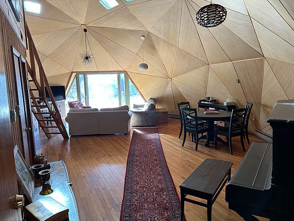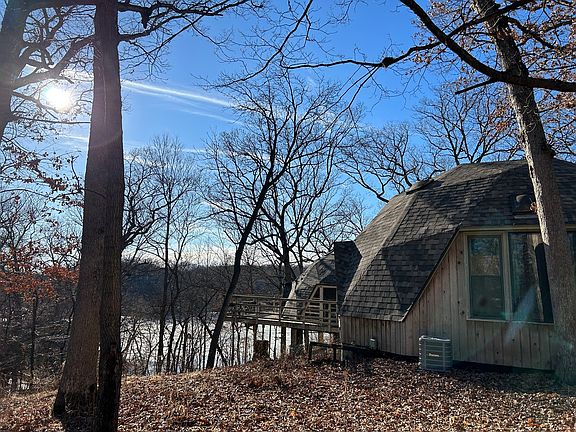 Unbelievable and one of a kind with soaring cathedral ceilings and skylights high on a high overlooking the lake! This amazing Lost Nation waterfront dome house is the perfect unique home or getaway! From the moment you enter, you will find yourself in another world. The main dome ceilings were put in in 2021 as well as new shingle roofs on both domes. The small flat roof section is older. Also in 2021, furnaces were added for both domes and air conditioners were replaced, much of the electrical was revised and many new light fixtures were added, a new built-in oven was added and the siding was power-washed and treated. There is still a lot to do here, but it's incredible and worth the work. It's very unique and fun. The main dome has a huge open kitchen/great room with water views which walks out to a deck that sits high in the trees overlooking the lake plus owner's bedroom with custom built-in wood drawers and closets, a small loft and full bath. The entry and laundry room separate that dome from the other which has a small office, two additional bedrooms, a full bath with tub/shower combo, a living room with beautiful treetop views, a large finished upstairs walk-up attic/bonus room, a one-car garage, and a partial unfinished walk-out basement. The lot to the right of the house goes down to the lake. The lot to the left has an awesome large stone firepit area. In addition to be lakefront, the lots to the left overlook Easter Park. This home with amazing views sits on 4 approximately half-acre lots with additional addresses 1008 and 1010 and 2 pins for 1012. Agents, all pins are 2209103007,2208229006,2208229005 and 2208229004. Owner is a licensed IL Real Estate Agent. It still needs a lot of love, but it is an amazing home and will be well-worth the effort. $5000 buyer credit towards a new skylight and whatever project you'd like to start. Otherwise, as-is. This home is not for people interested in traditional homes or that need everything just so-it's a very beautiful, unique and fun property, but also a work in progress. Don't miss your chance to have lakefront on Lost Lake for a great price!