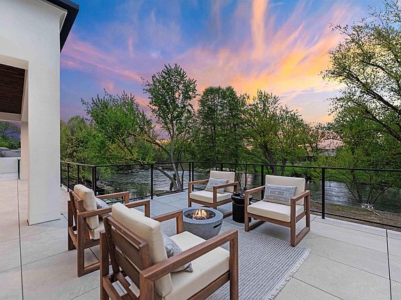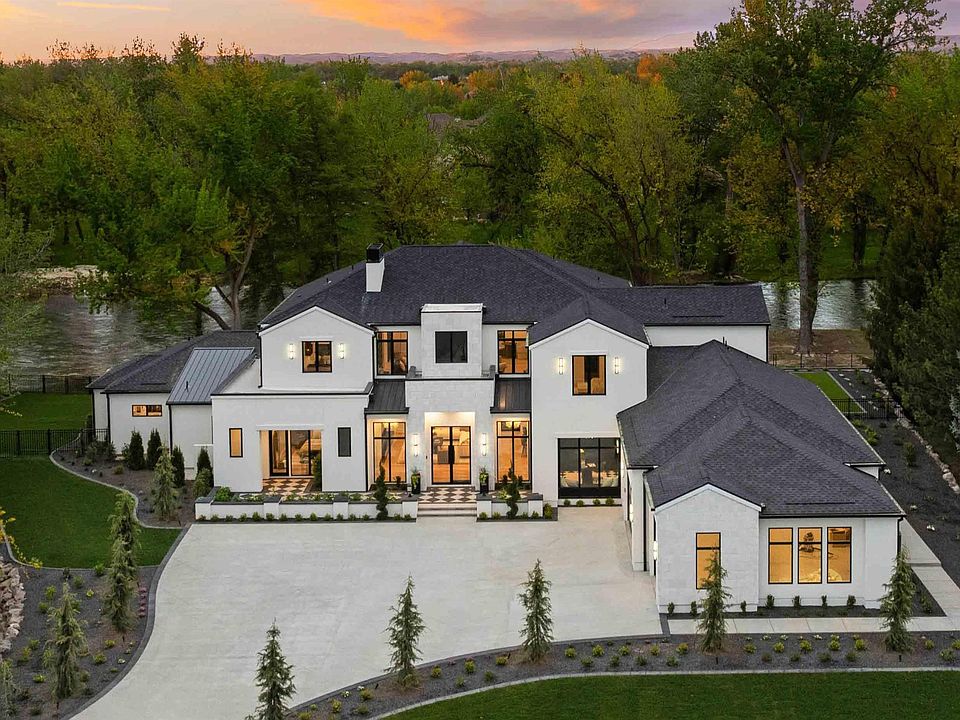 Welcome to this riverfront 2025 Parade of Homes estate in the prestigious Streamside neighborhood, custom built by Legacy Homes. Perfectly positioned on a quiet cul-de-sac with direct Boise River access, this residence boasts a resort-style backyard with a pool, outdoor kitchen, shower, and seamless indoor/outdoor living through ceiling-height windows and doors. Inside, a soaring stone fireplace anchors the open-concept great room with exposed beams and designer lighting. The gourmet kitchen offers dual waterfall islands, a panelized fridge, and flows into a stunning custom pantry with island, cabinetry, and wine cellar. The master suite continues the luxury with backyard access, a private coffee bar, spa-like bath with dual vanities, soaker tub, and expansive walk-in closet. A main-level guest suite adds comfort, while upstairs hosts a gym, loft, additional suite, built-in bunks, and full balcony. With a golf simulator, oversized garage, and meticulous craftsmanship, this masterpiece defines luxury living.